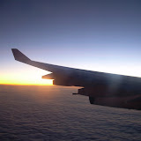 Obudziłem się dokładnie o wschodzie słońca nad Afryką. Coś niesamowitego. 10 tysięcy metrów nad Ziemią, a w dole chmury wyglądające jak ubity śnieg na stoku, powyżej niebo z początku ogniście pomarańczowe, od wschodzącego słońca, później przechodzące gwałtownie w intensywny błękit i dalej coraz ciemniejsze aż do czerni nocy...